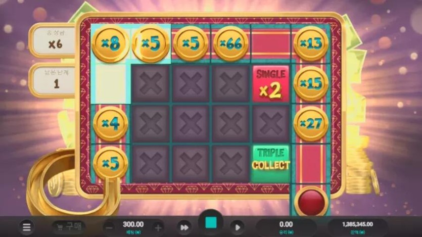 1회 스핀 혹은 당첨 될 때 마다 배수가 증가하는 게임입니다.
